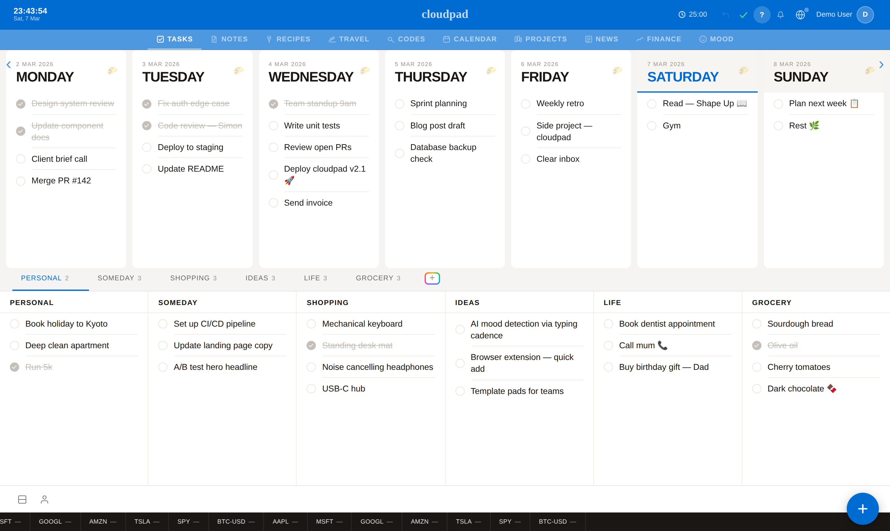 cloudpad is an all-in-one personal productivity workspace — weekly planner, notes, to-do lists, personal finance tracker, recipe manager, travel planner, Pomodoro timer, and AI assistant (Claude & ChatGPT) in a single beautifully designed app. Works on web, mobile, and tablet.